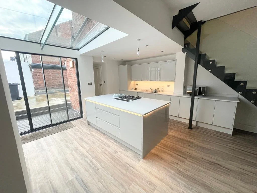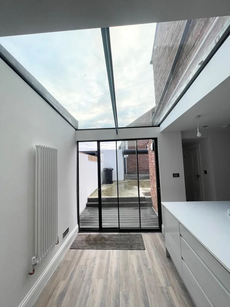 Demolition of multiple rear outbuilding to form usable family rear yard and off street parking, internal modernisation and interior design with glass and steel extension and stair.